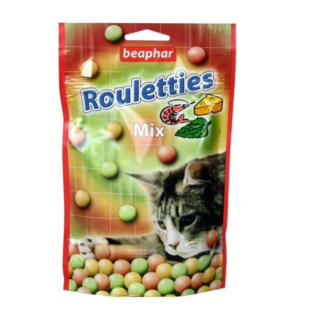 A gömbölyű Beaphar Rouletties Mix falatkák felébresztik a cicákban a természetes játékösztönt. A visszazárható tasak háromféle ízt rejt: sajtosat, garnélásat és macskamentásat.